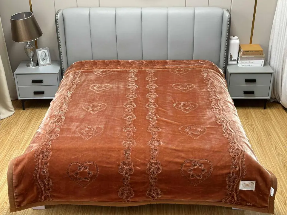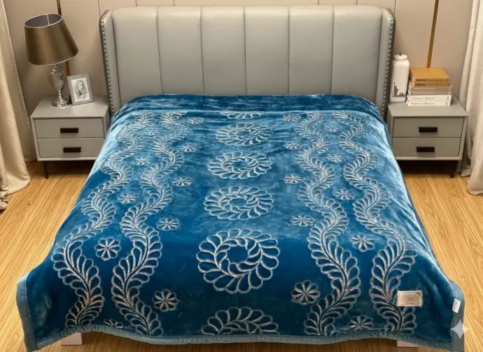 Get cozy with this elegant blue velvet blanket, featuring beautiful embroidery