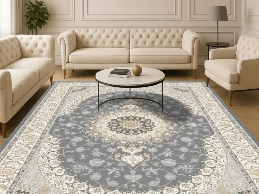 Enhance your living space with this sophisticated grey rug. Its intricate pattern adds a touch of classic elegance to any room